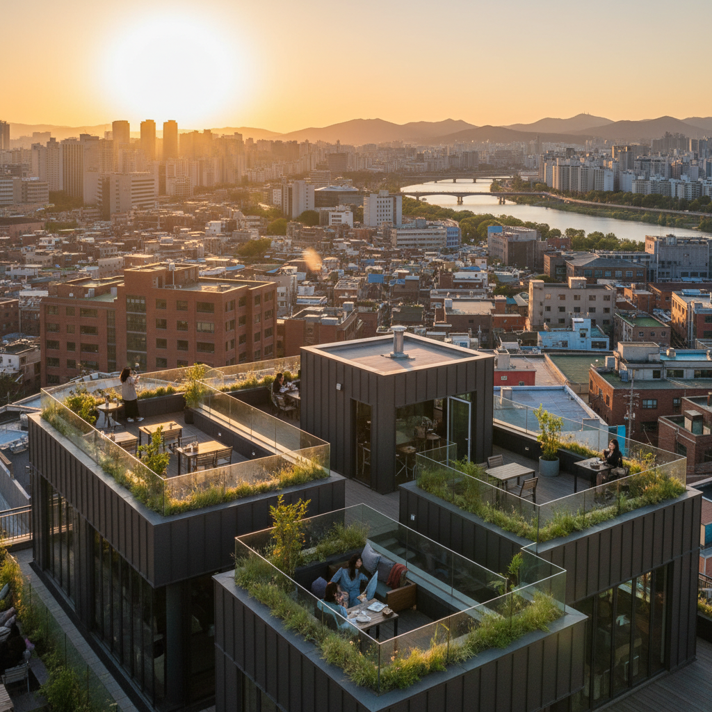 Hidden rooftop cafés offer relaxing views of Seongsu’s industrial skyline.